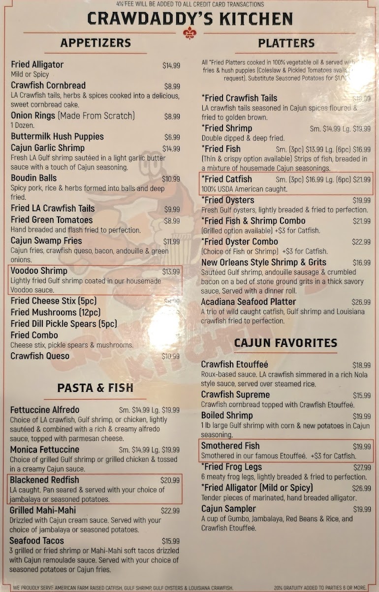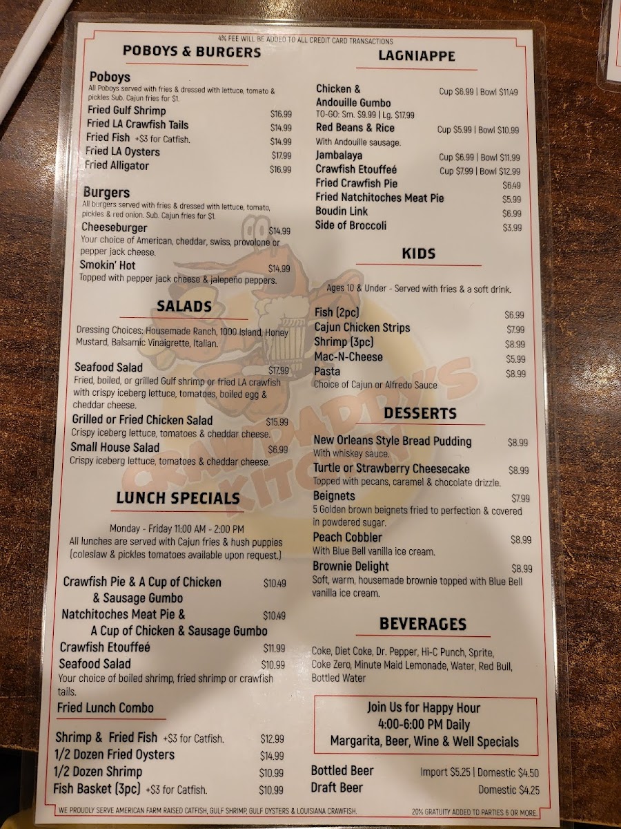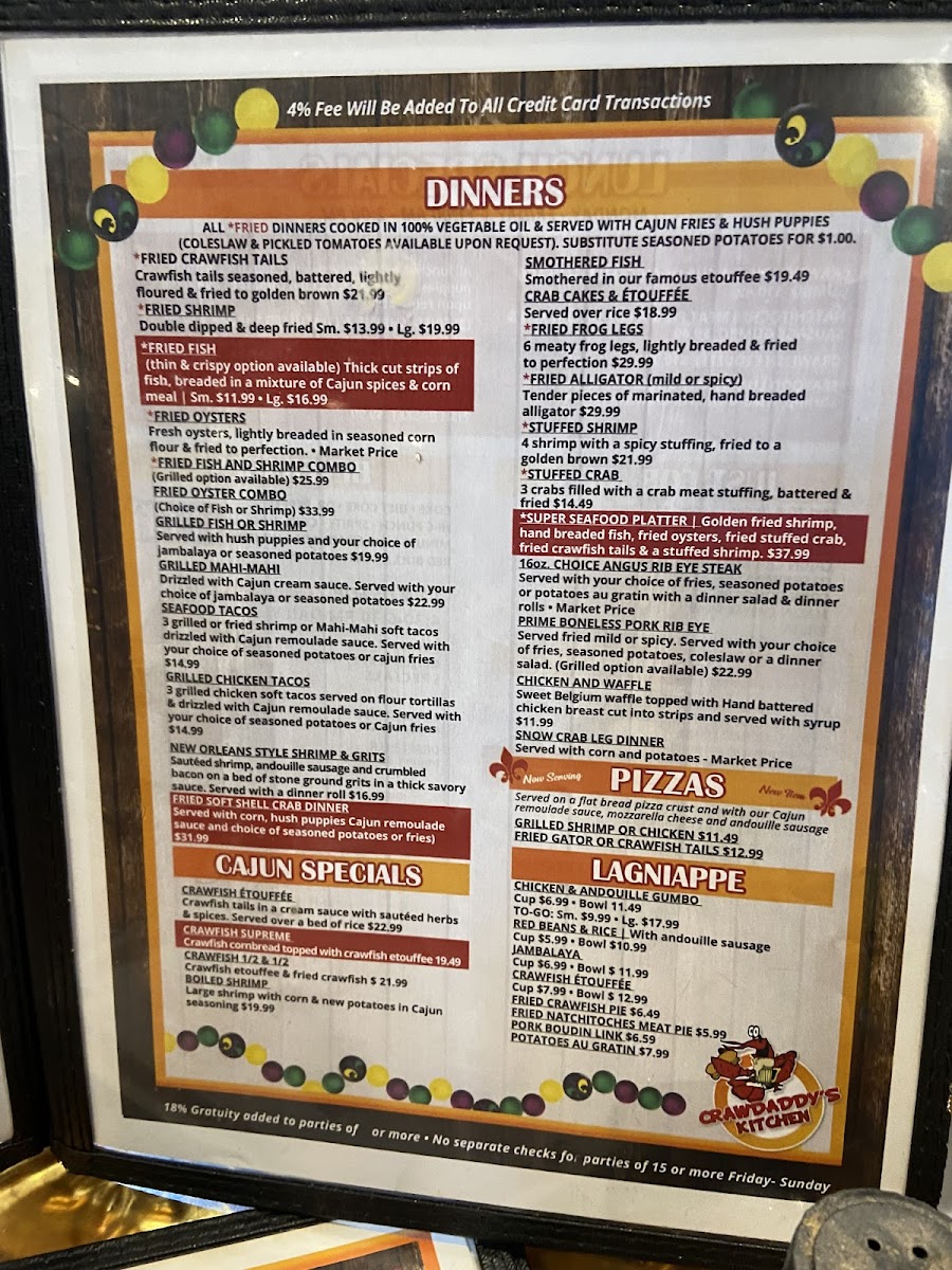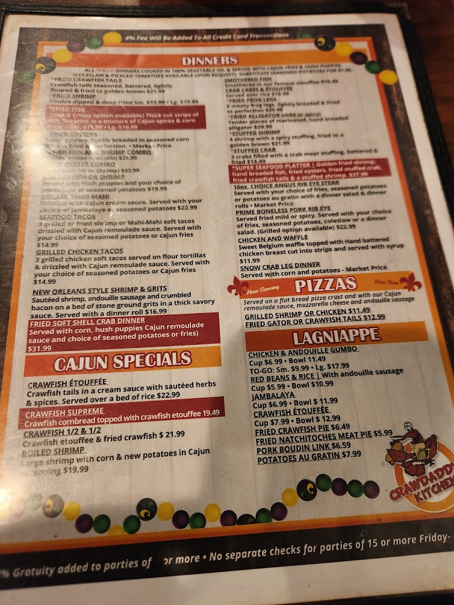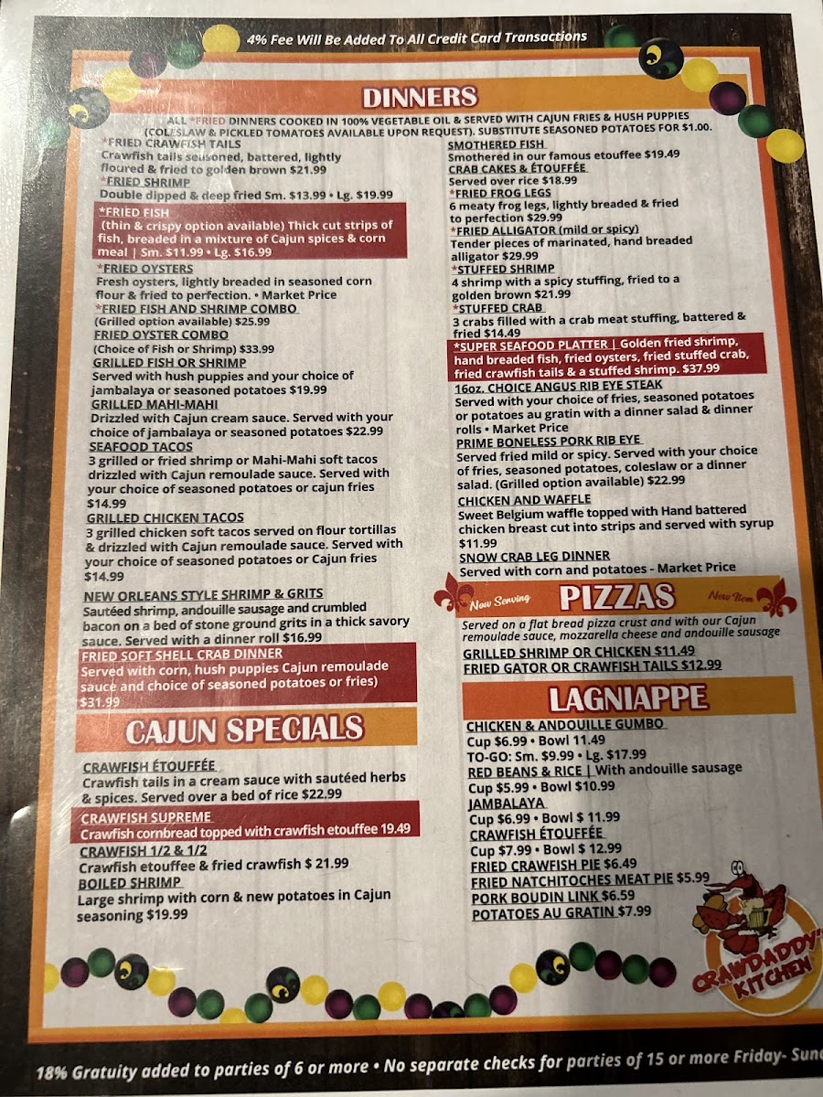 Crawdaddy's Kitchen offers a menu that reflects its roots in Cajun and Southern seafood traditions, featuring approachable and satisfying dishes ideal for casual dining. The selection invites guests to enjoy hearty, flavorful meals in a lively and welcoming setting, perfect for gatherings that range from relaxed lunches to long, leisurely dinners.