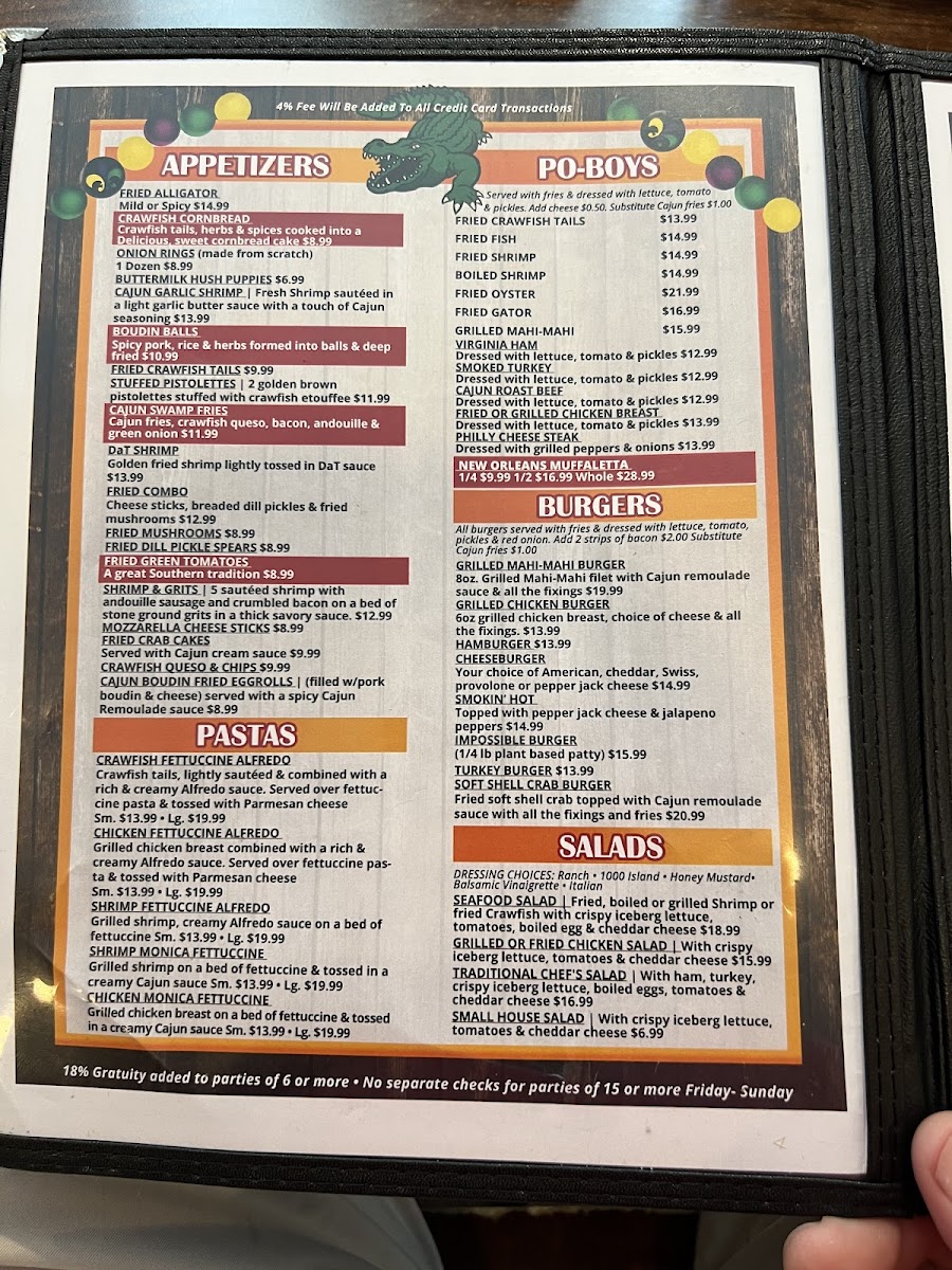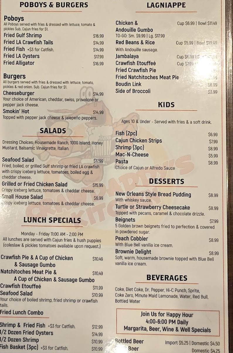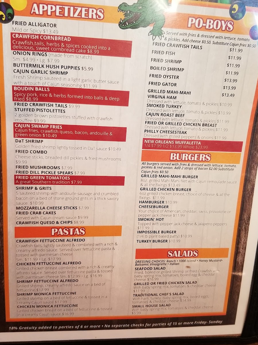 The menu presents a variety of options that highlight the bold, comforting flavors of the region. You’ll find classic Cajun staples like fried crawfish tails and shrimp & grits alongside inventive takes such as crawfish fettucine Alfredo and Cajun swamp fries. Lighter starters like fried green tomatoes or boudin balls pair well with the buzzing, communal atmosphere, while desserts like New Orleans style bread pudding and beignets bring a touch of Southern sweetness to round out the meal.